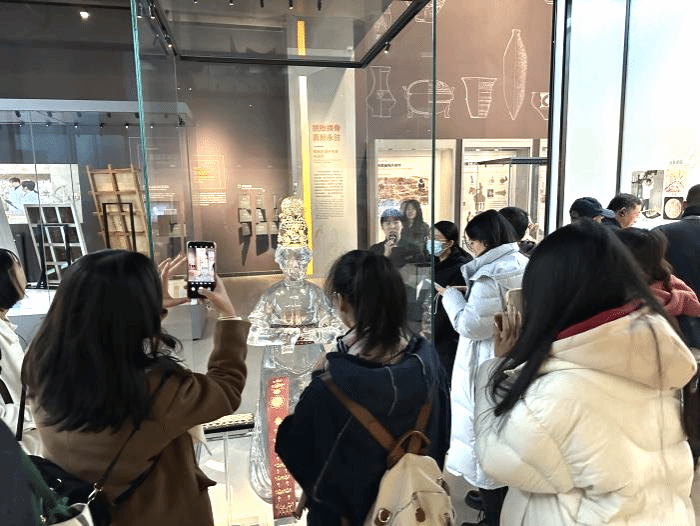 “考古发现篇二”展馆展示了唐、宋时期的丰富文物,有栩栩如生的雕塑、珠光宝气的首饰、陪葬用的三彩雕塑、琳琅满目的耀州窑青瓷等,全面展现了当时的美术、墓葬、天文、音乐等方面的文化艺术成就。讲解员以唐宗室女李倕的头冠为例讲解了当时的饰品文化,解读了每个部位上各种首饰的内涵,使同学们大开眼界。