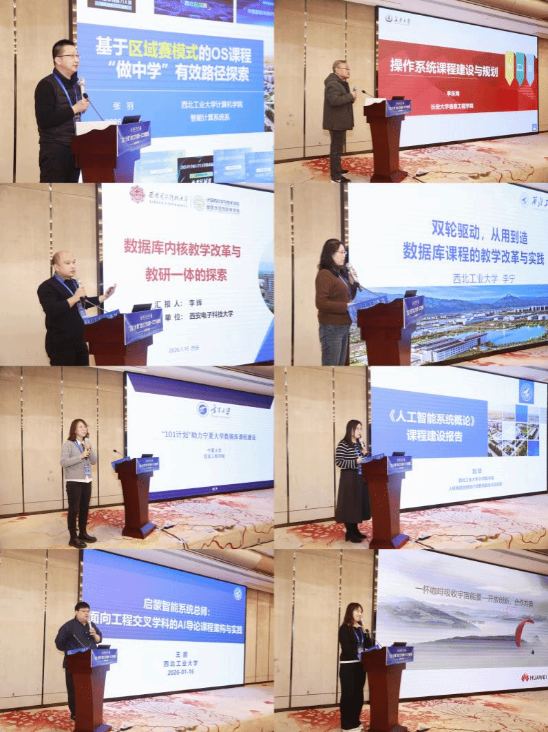 z6mg人生就是博官网张羽做了“基于区域赛模式的OS课程“做中学”有效路径探索”报告,详细分析了国内外高校操作系统课程改革进展以及如何通过“操作系统设计赛区域赛”实现“以赛促课”;长安大学李东海分享了长安大学在操作系统课程教学与改革发展情况。西安电子科技大学李辉介绍了“数据库内核教学改革与教研一体的创新实践”,其团队打造的“库道”实训平台已在全球114所高校应用;z6mg人生就是博官网李宁、宁夏大学杜方则围绕数据库系统课程“从用到造”的教学转型与校地协同建设数据库系统课程的经验进行了交流。人工智能导论课程方面,z6mg人生就是博官网刘琰、王鹏分别结合“三航”优势与跨学科特色,分享了西工大在人工智能导论课程知识内容重构与实践模式创新的教改成果。华为西研所副所长刘晓莉带来“一杯咖啡吸收宇宙能量”的高校合作主题报告,为校企协同育人提供了新思路。