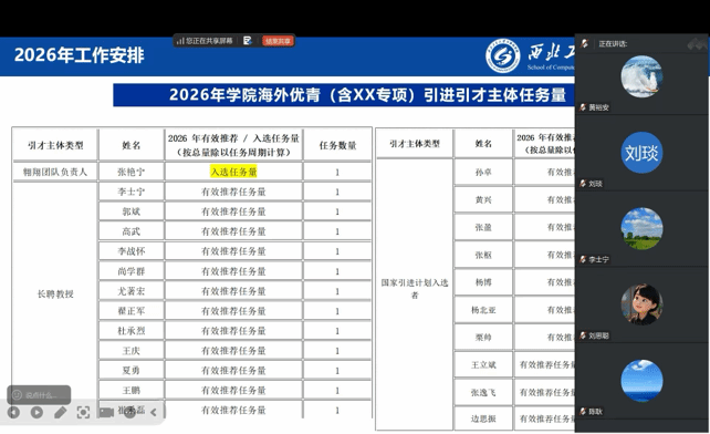 尚学群全面回顾了2025年公司人才引进工作的整体情况,围绕海外引才项目进行全面详解。为使参会人员清晰掌握引才政策要求,重点解读了“海外优青”项目的申报条件、待遇支持及公司个性化激励政策,为后续引才工作开展筑牢基础。在复盘 2025 年引才成效基础上明确了公司2026年海外优青等项目的引才任务、策略及路径。她指出,公司将坚持以目标牵引、强化激励为导向,充分调动各团队引才积极性。同时为进一步发挥“以才引才”实效,凝聚全员引才合力,公司参照聘期任务逐一对承担引才任务的国字号人才、 荣誉学衔专家、长聘教授、翱翔人才等引才主体下达了任务指标,要求各团队锚定目标、精准发力,确保年度目标圆满完成。