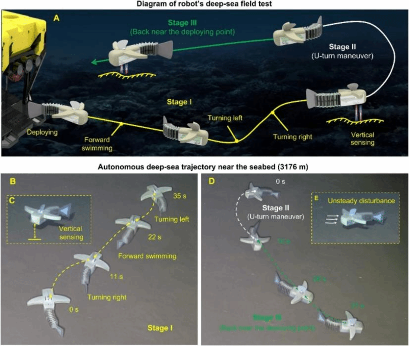 该研究为面向深海探测的软体机器人提供了感控算一体的普适性解决方案,将传感器、控制电路、电池等核心组件一体化集成于软体机身。系统研究了柔性电液单元在高压、低温环境下的力电耦合大变形效应,赋予系统良好的大变形能力,实现了驱动单元内部介电液与深海压力的自适应平衡。所研制的深海软体机器人长约32cm,翼展宽约18cm,重量约670g,突破了传统深海装备依赖外部遥控的瓶颈。在3176米深度的深海环境试验中,机器人成功完成复杂轨迹运动、近底感知探测、自主姿态调控、返航等系列任务,验证了其在深海极端压力和复杂流动环境下的感知能力和可靠机动性。该成果突破了深海低温和高压造成的性能限制,为海洋机器人技术的发展奠定了新的坚实基础。