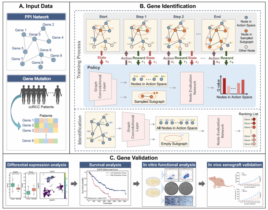 透明细胞肾细胞癌 (ccRCC) 是最常见的肾细胞癌亚型。然而,现有研究对ccRCC基因层面的风险因素的了解仍然有限,这对其患者的诊断和治疗带来了挑战。传统癌症风险基因识别方法主要基于突变频率识别风险基因,但某些关键驱动基因(如 PIK3CA)在ccRCC患者中突变频率较低(不足5%),并且由于癌症的遗传基础极其多样,不同患者间的突变模式存在显著差异,导致基于突变频率的方法和无监督方法在泛化性和准确性上受限。监督学习方法依赖大量已知高置信度风险基因作为训练样本。然而,目前已知的ccRCC高置信风险基因数量有限,限制了这类方法的应用和性能。为了解决这些挑战,该论文提出了一种基于深度强化学习的计算方法RL-GenRisk,结合ccRCC患者的高通量测序数据,识别ccRCC的风险基因。与传统的监督模型不同,RL-GenRisk将ccRCC风险基因的识别建模为马尔可夫决策过程,通过结合强化学习范式,基于生物网络与高通量癌症患者测序数据设计数据驱动的奖励机制,从而解决监督学习方法受限于有限标签数据的挑战。实验结果表明,RL-GenRisk在ccRCC风险基因识别问题上优于现有方法,通过在膀胱癌和胶质母细胞瘤患者数据上的实验发现,RL-GenRisk也可以被应用于其他癌症的风险基因识别任务。此外,RL-GenRisk识别出了一些潜在的ccRCC风险基因。通过与四川大学华西医院合作,结合体内与体外实验成功验证了EGFR和PCLO两个基因,发现这两个基因的失调都会显著影响ccRCC的进展,表明RL-GenRisk所识别出的风险基因具有作为ccRCC潜在治疗靶点的潜力。