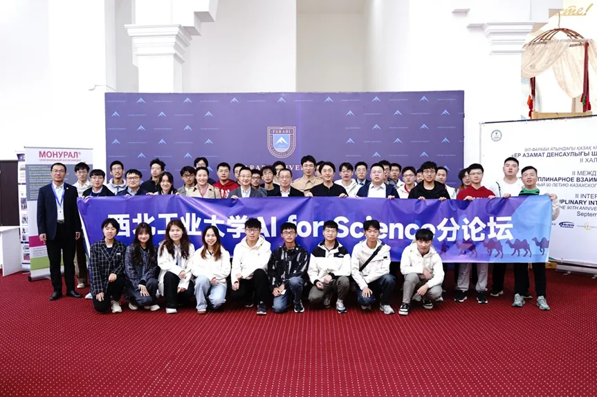 To thoroughly implement the spirit of General Secretary Xi Jinping's important instructions on running the Kazakhstan Branch of Northwestern Polytechnical University (NPU) well, with the guidance and support of the Graduate School, the Office of International Cooperation, and the Kazakhstan Branch, Xia Yong, Associate Dean of the School of Computer Science, Cui Helei, Assistant to the Dean, teacher representatives including Zhang Yu, Liu Zhaowen, Chen Bolin, Wang Xiaoqi, and Pan Yongsheng, along with 30 students, traveled to Al-Farabi Kazakh National University to celebrate its 90th anniversary. They successfully hosted the AI for Science Sub-Forum at the university’s "Belt and Road" International Conference on Advanced Materials Genomics and Intelligent Science. Professors Jia Xiaohua and Wang Cong from City University of Hong Kong were specially invited to participate in the sub-forum.